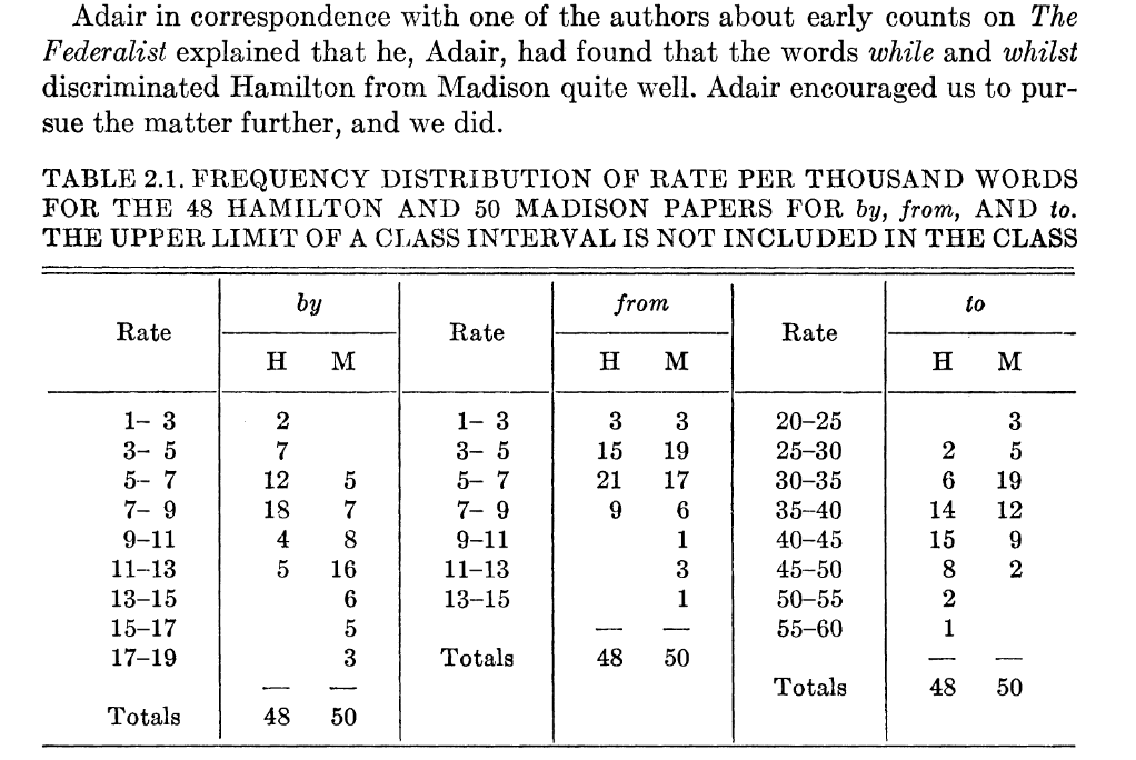 Mosteller and Wallace took a very hands-on and guided approach, counting numbers of certain ‘filler’ words per block of 200 words: