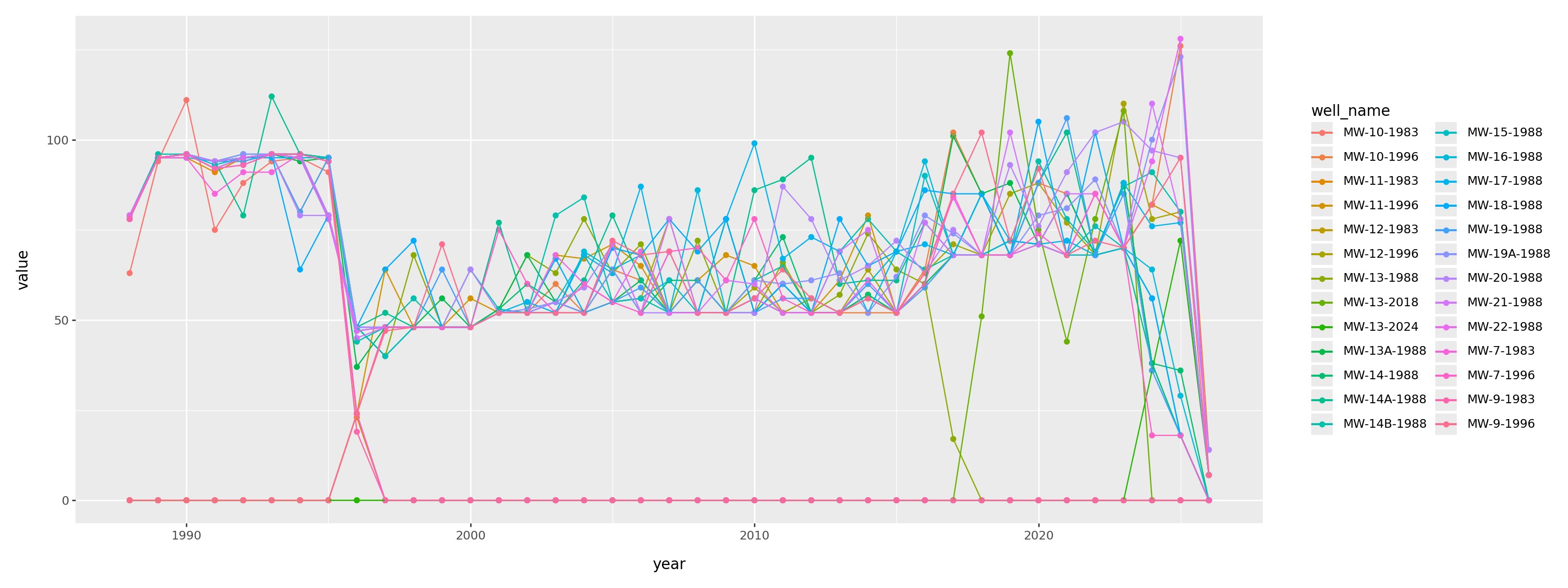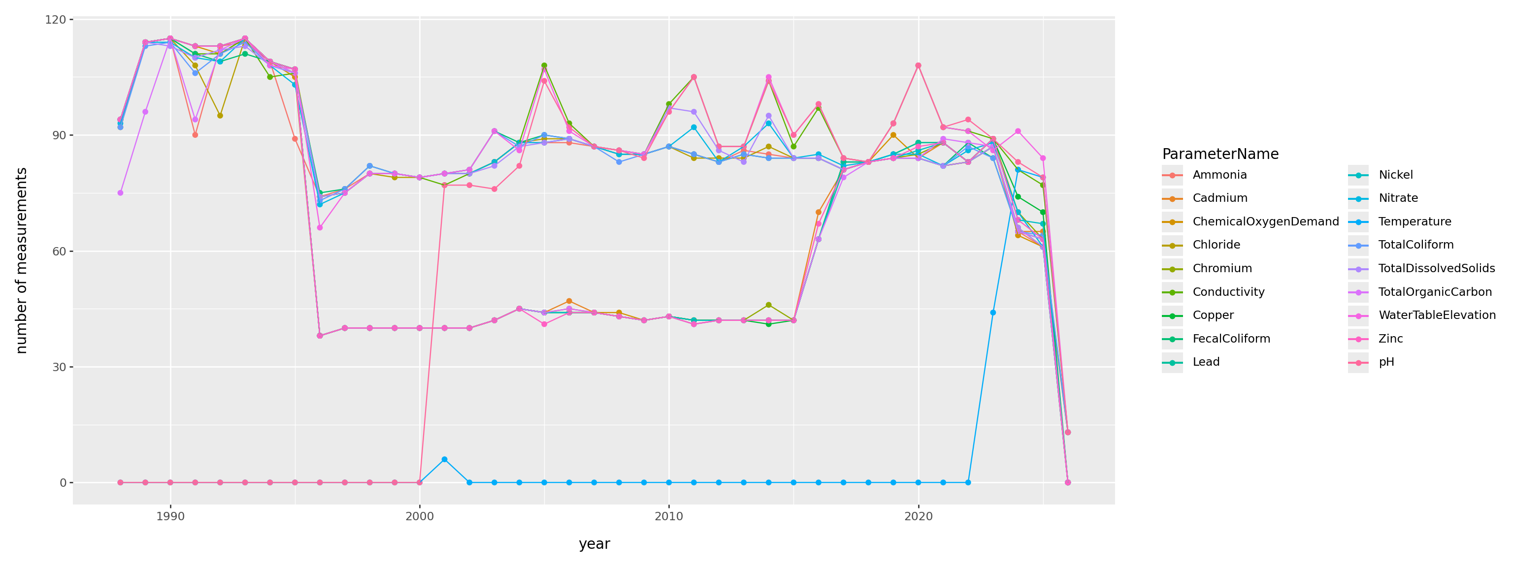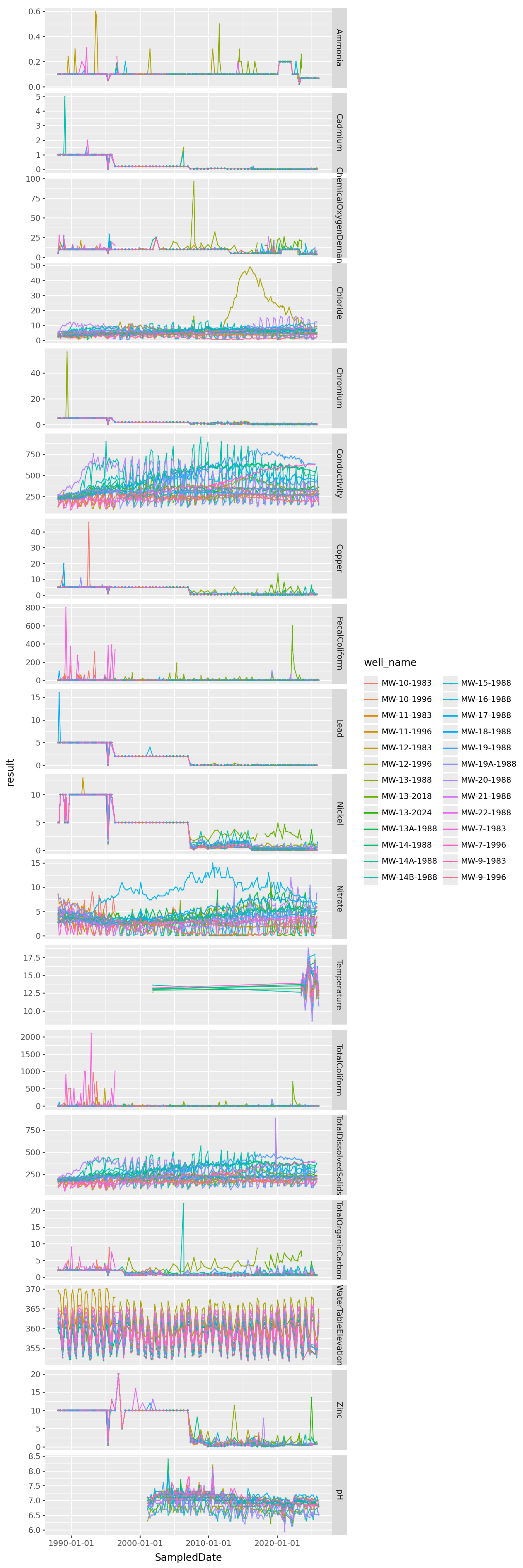 pd.crosstab(gw['well_name'], gw['ParameterName'])| ParameterName | Ammonia | Cadmium | ChemicalOxygenDemand | Chloride | Chromium | Conductivity | Copper | FecalColiform | Lead | Nickel | Nitrate | Temperature | TotalColiform | TotalDissolvedSolids | TotalOrganicCarbon | WaterTableElevation | Zinc | pH |