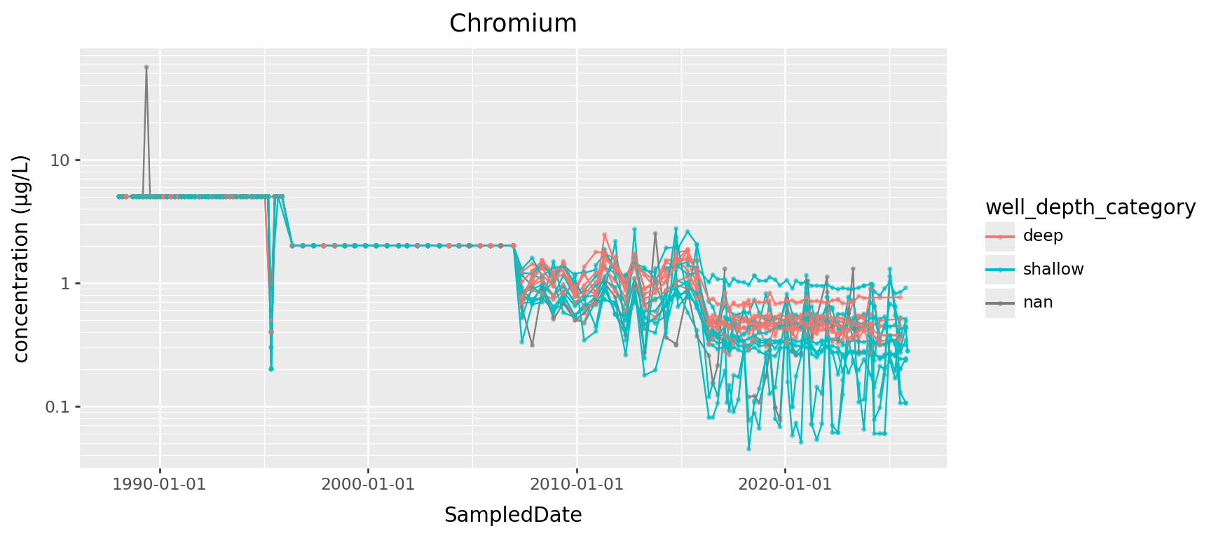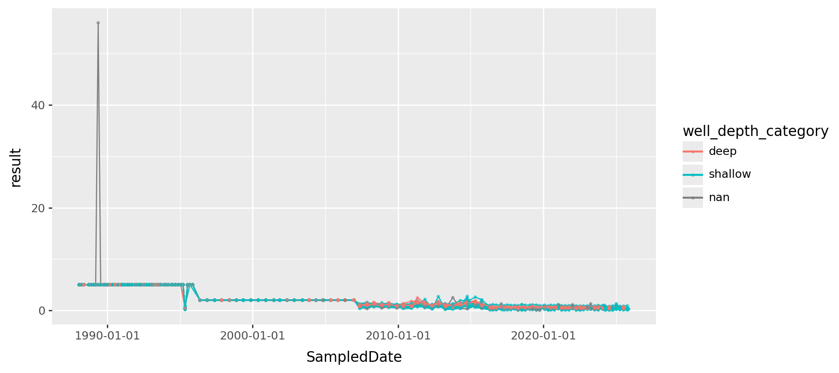 p9.ggplot(p9.aes(x="SampledDate", y="result", color='well_depth_category', group='well_name'))