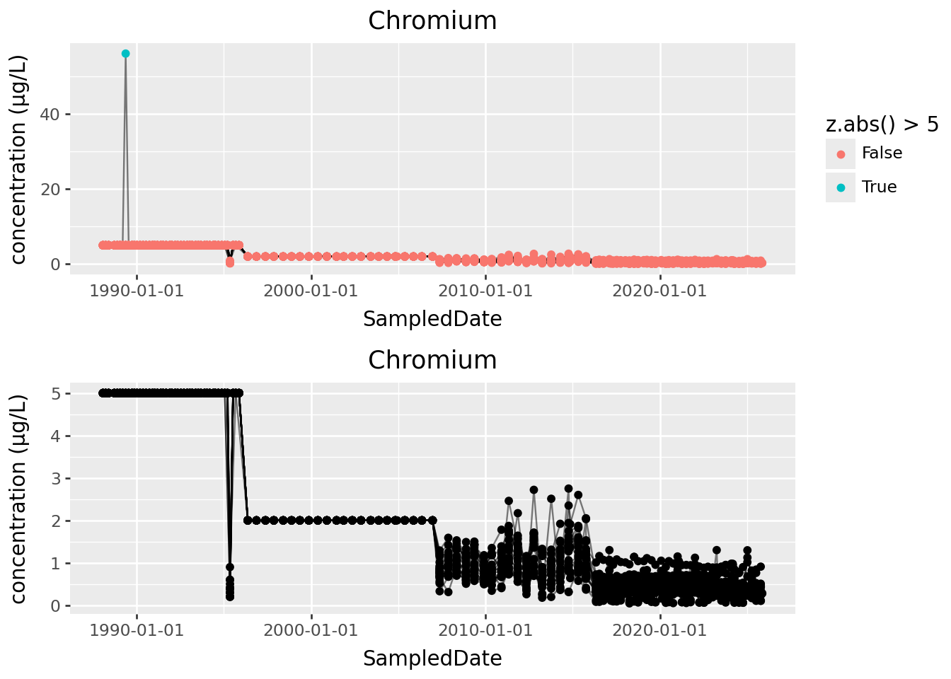 .loc[(gw['ParameterName'].isin(metals)) & (gw['SampledDate'].dt.year >= 2016), :]