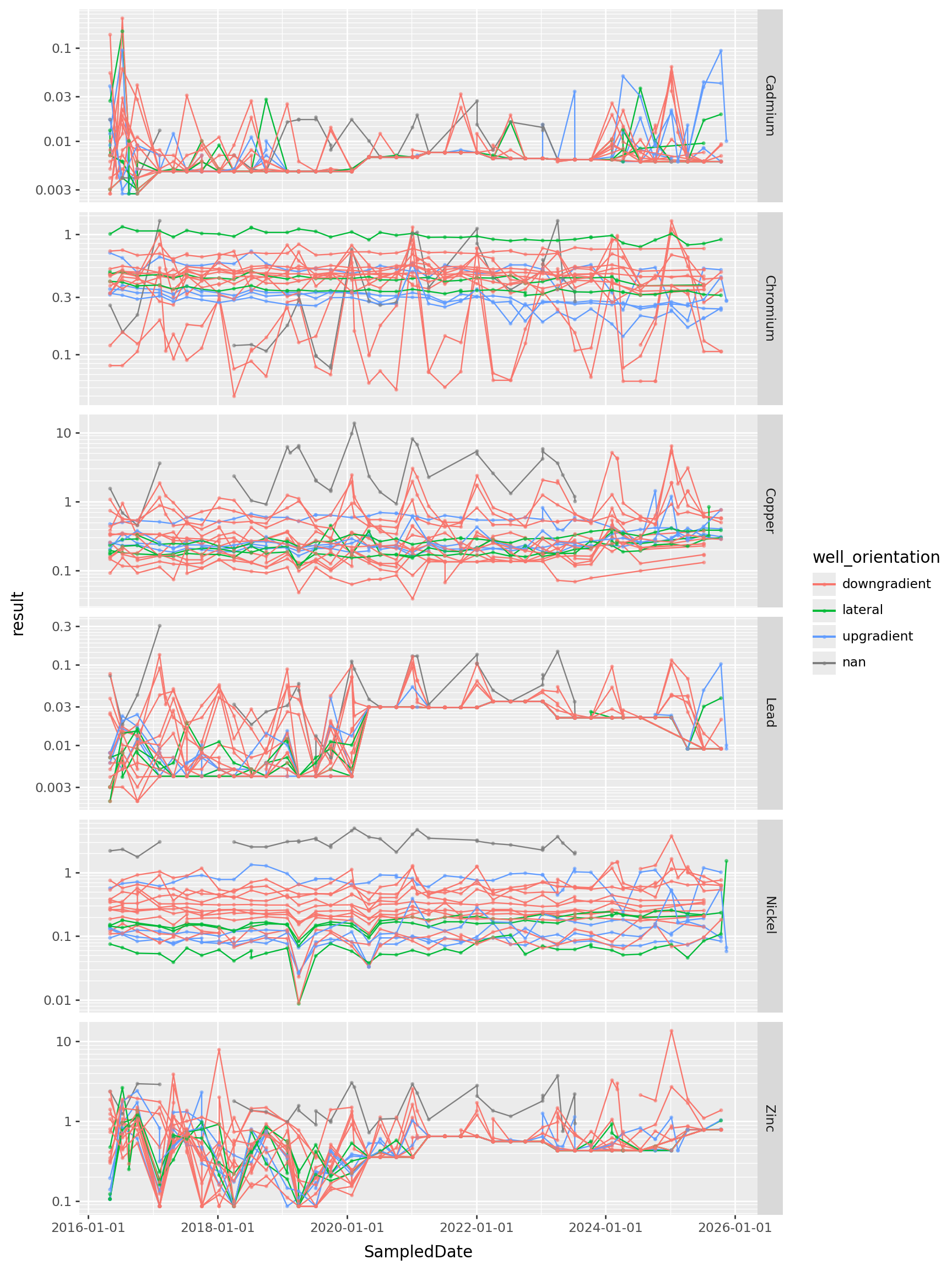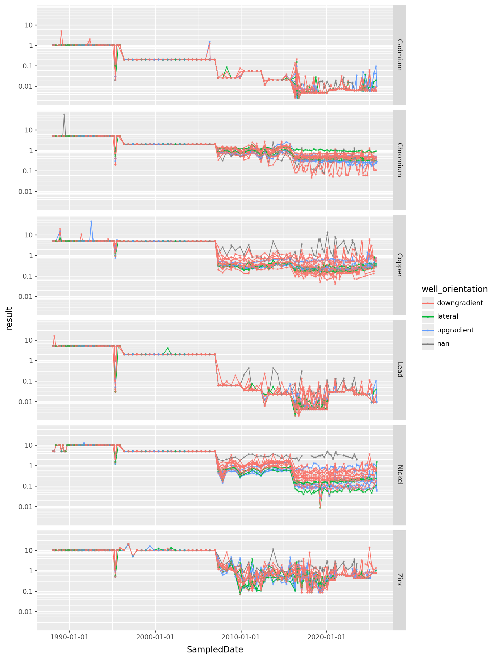 >> p9.ggplot(p9.aes(x="SampledDate", y="result", color="well_orientation", group="well_name"))