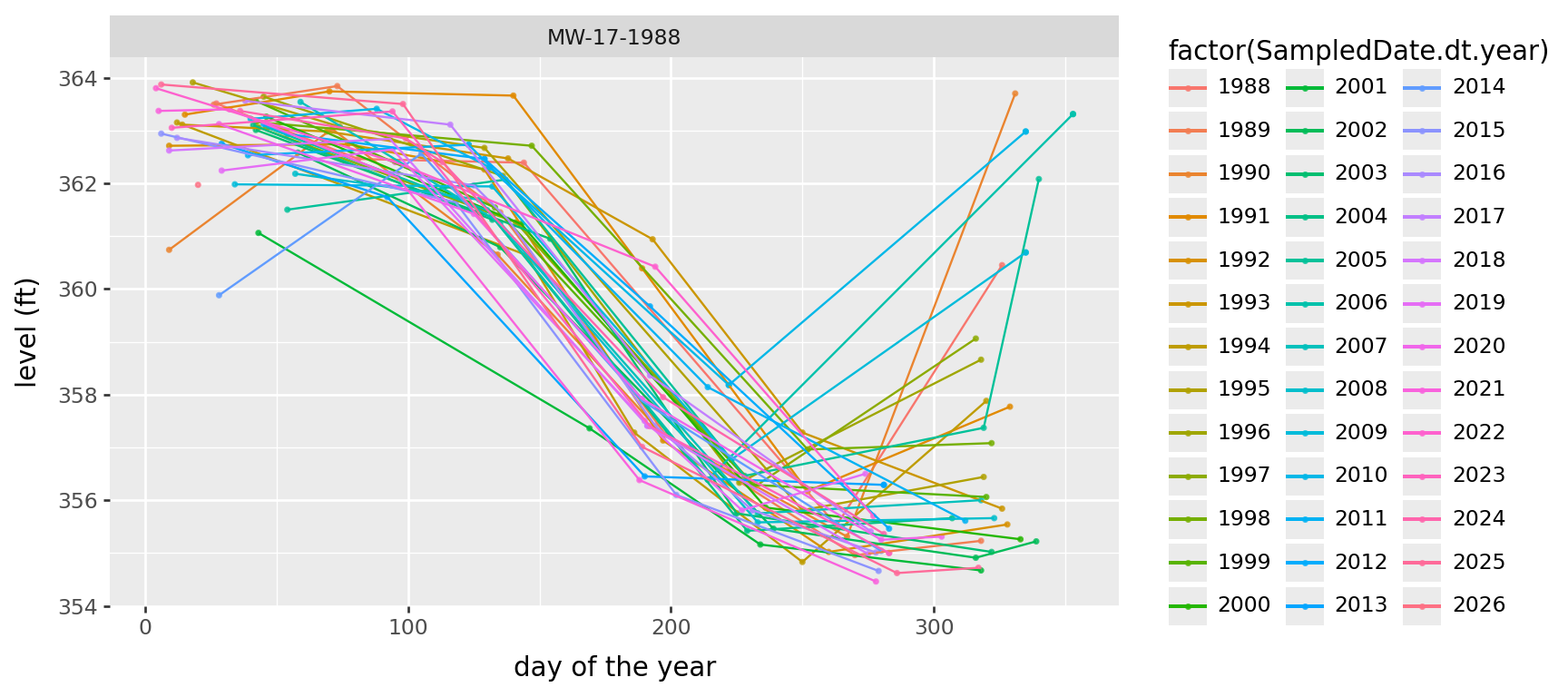 + p9.labs(x='day of the year', y='level (ft)')