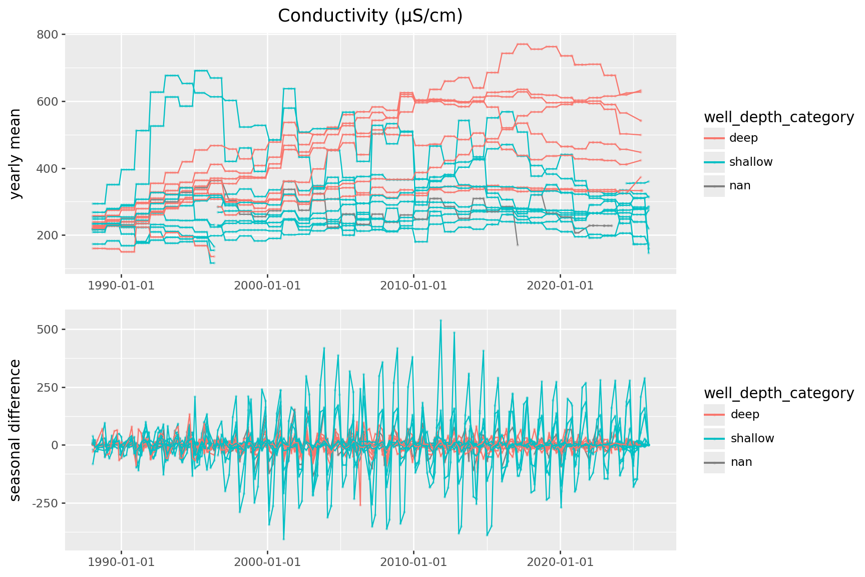 p9.ggplot(p9.aes(x="SampledDate", y="diff_conductivity", color='well_depth_category', group='well_name'))