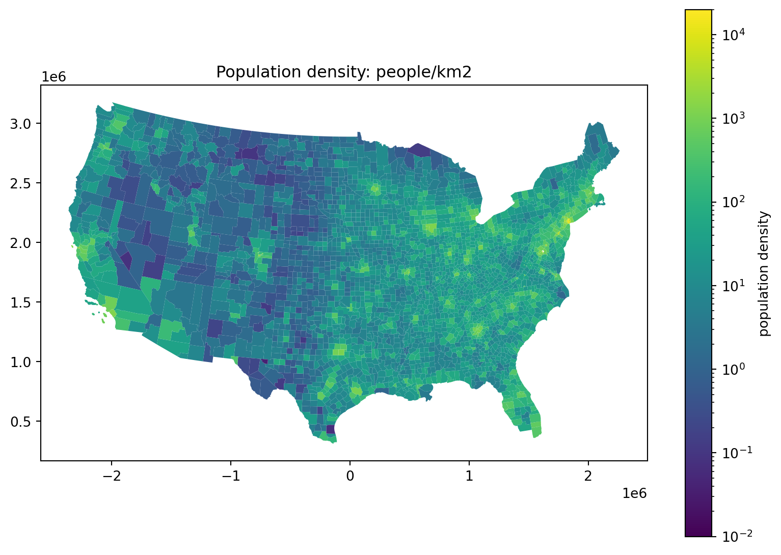 ax.set_title("Population density by county (people/km2)")