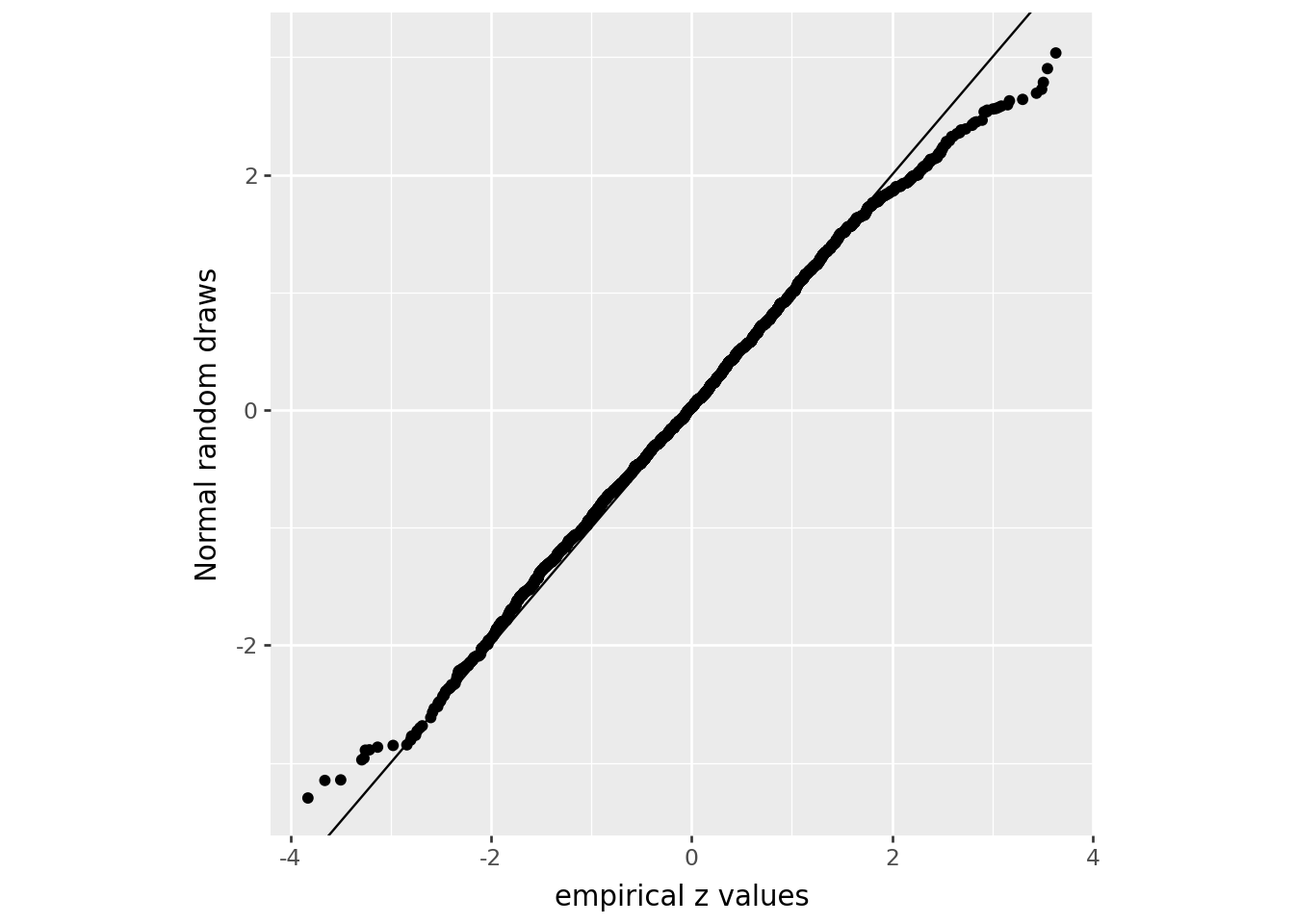 + p9.labs(x='empirical z values', y='Normal random draws')